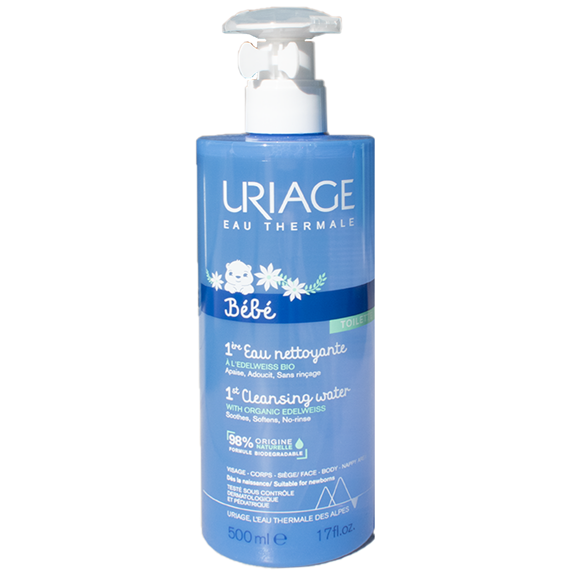 Uriage Baby Cleansing Water gently cleanses and removes dirt and is ideal for the baby's daily wash routine as it can be used on face, body and diaper area.
